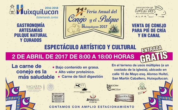 El próximo domingo 2 de abril, en Huixquilucan se realizará la tradicional Feria del Conejo y el Pulque, actividad que llega a su onceava edición y se efectuará de manera coordinada entre el Gobierno Municipal que encabeza el alcalde Enrique Vargas del Villar y la Asociación de Cunicultores